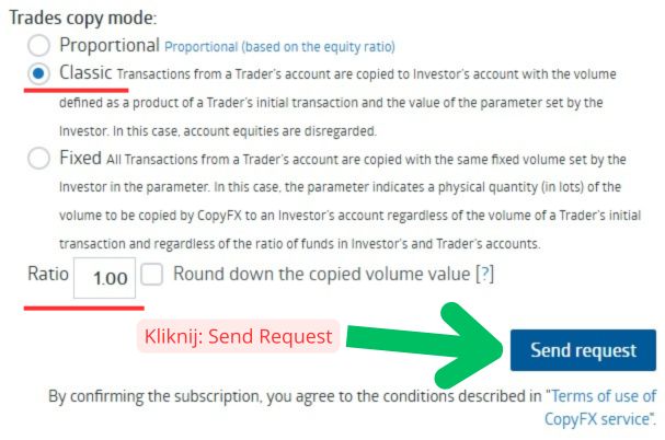 Kliknij: Send Request (jak zmieniasz ratio podczas zarobku to zamiast Send Request masz Change Mode)