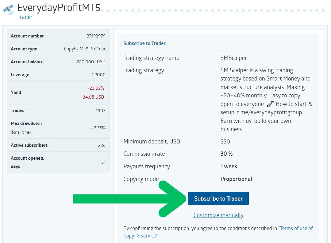 - Jeżeli widzisz guzik “Unsubscribe from Trader” to znaczy, że jesteś podpięty i też go NIE KLIKAJ.